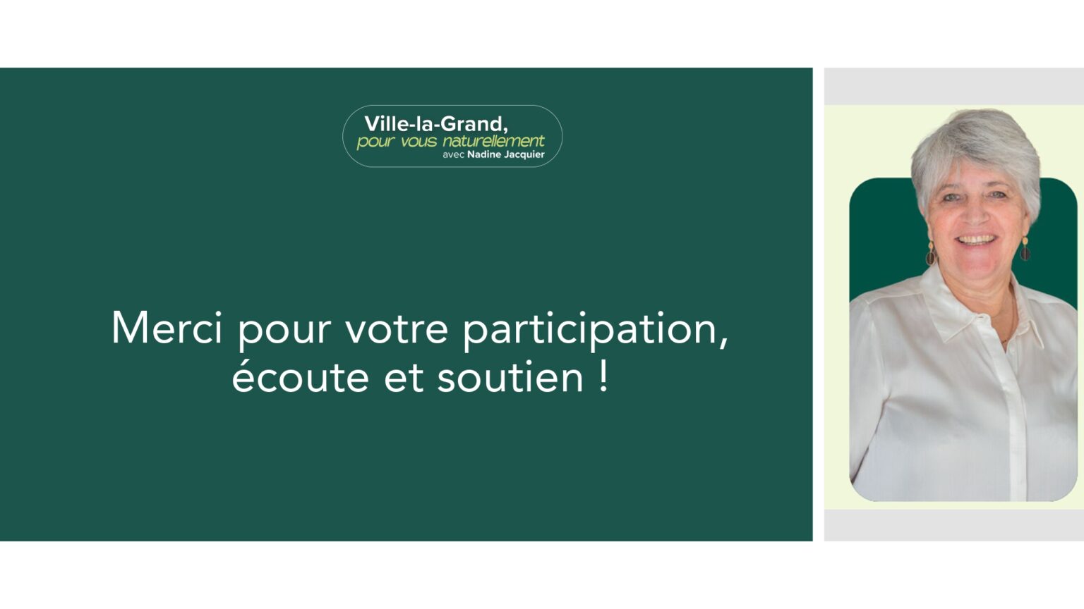 Votre soutien et votre confiance nous sont précieux. À très bientôt pour la suite de cette aventure collective. Alors si vous voulez voir aboutir l’ensemble des projets initiés : votez pour la liste menée par Nadine Jacquier “Ville-la-Grand, Pour vous naturellement” le 15 mars prochain.