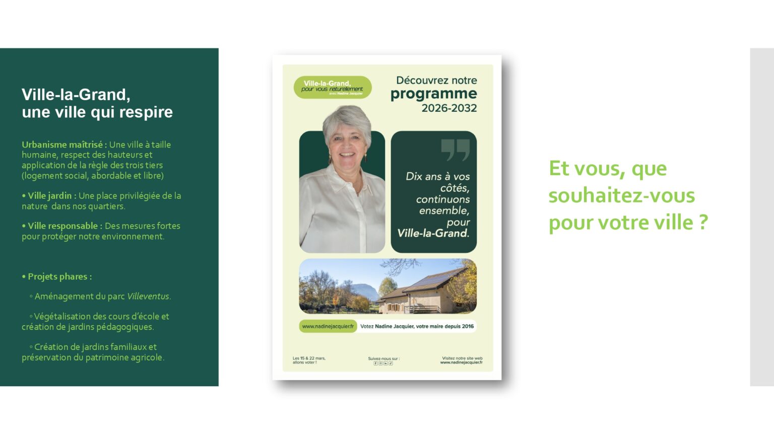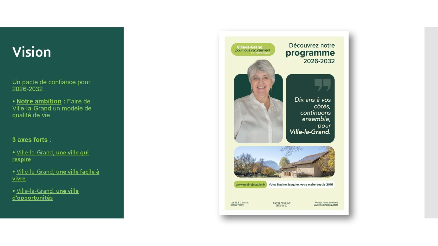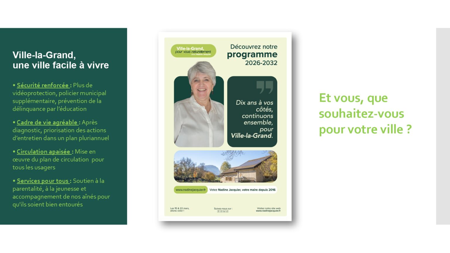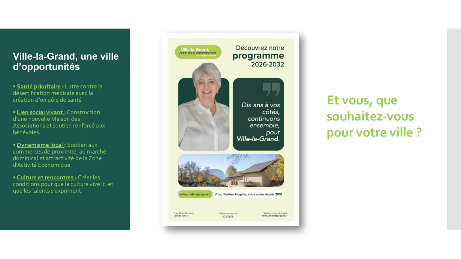 Votre soutien et votre confiance nous sont précieux. À très bientôt pour la suite de cette aventure collective. Alors si vous voulez voir aboutir l’ensemble des projets initiés : votez pour la liste menée par Nadine Jacquier “Ville-la-Grand, Pour vous naturellement” le 15 mars prochain.