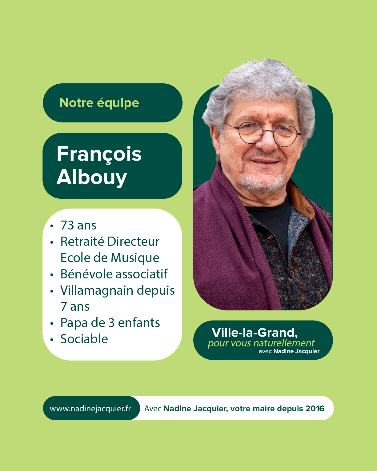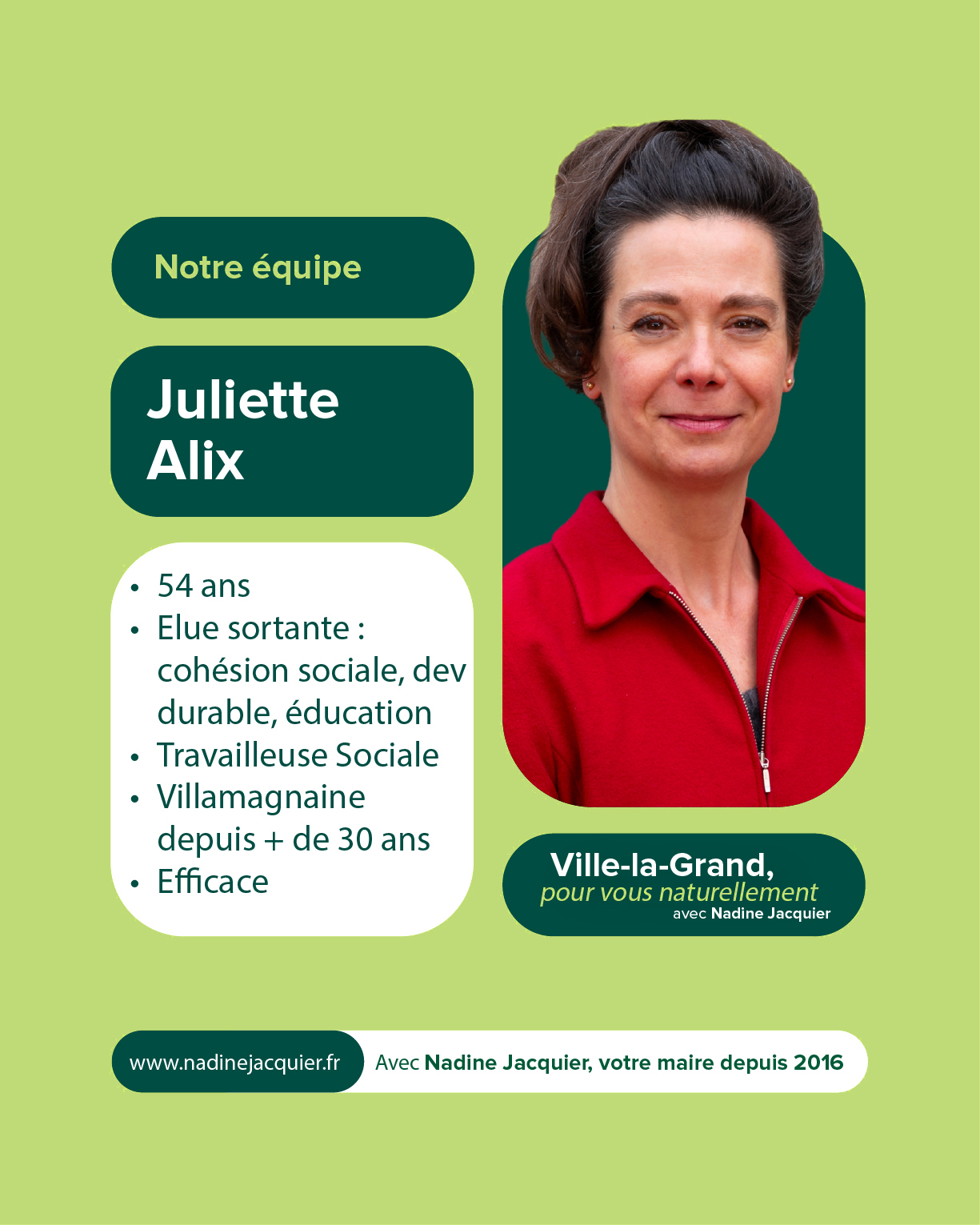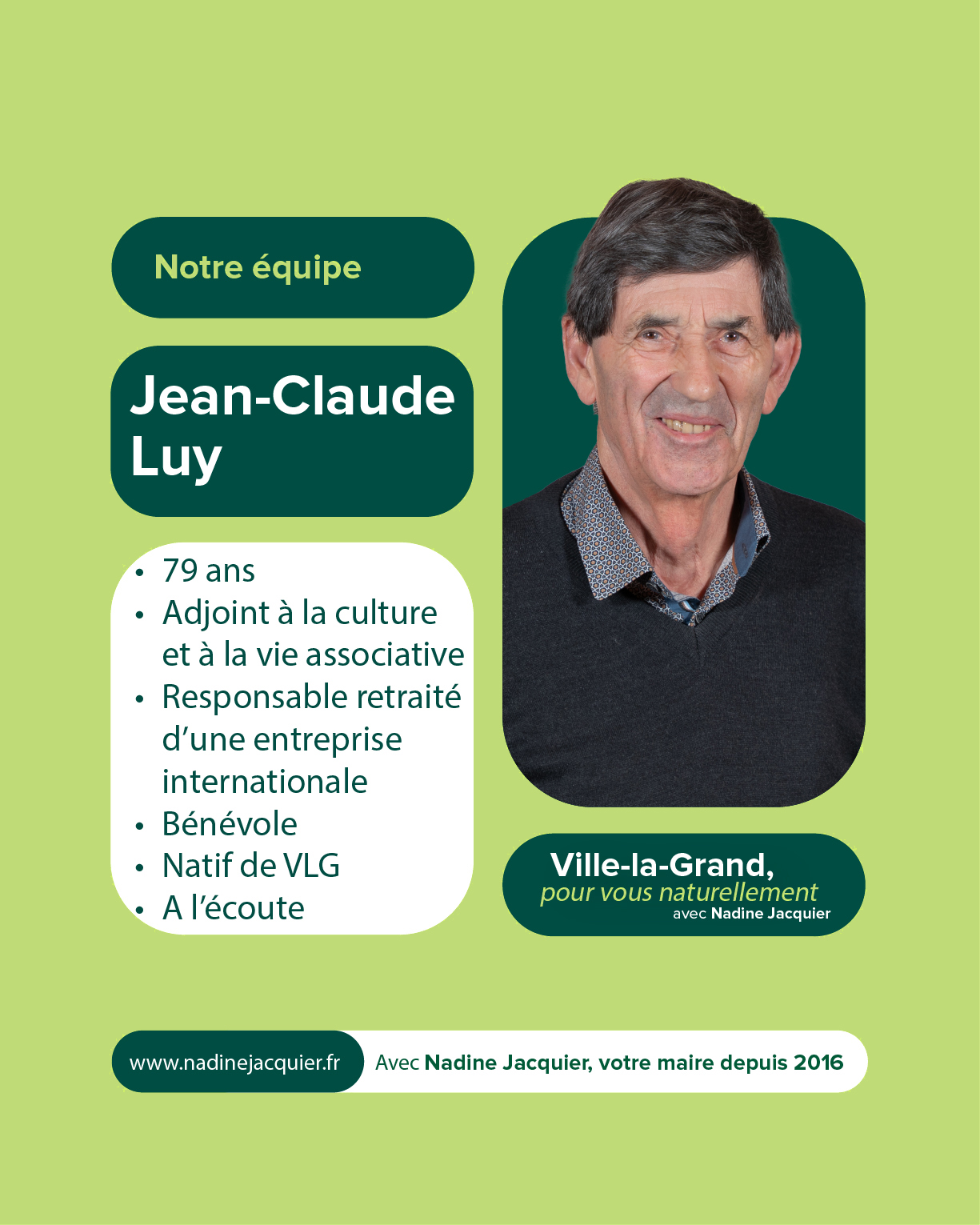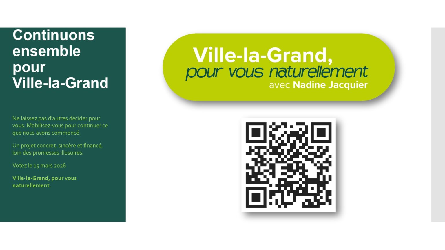 Votre soutien et votre confiance nous sont précieux. À très bientôt pour la suite de cette aventure collective. Alors si vous voulez voir aboutir l’ensemble des projets initiés : votez pour la liste menée par Nadine Jacquier “Ville-la-Grand, Pour vous naturellement” le 15 mars prochain.