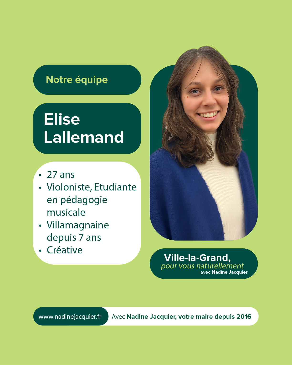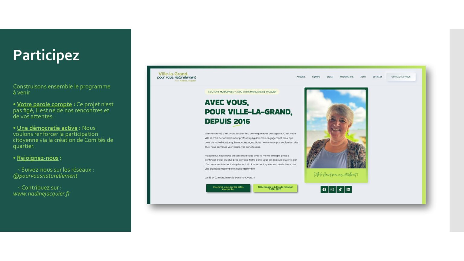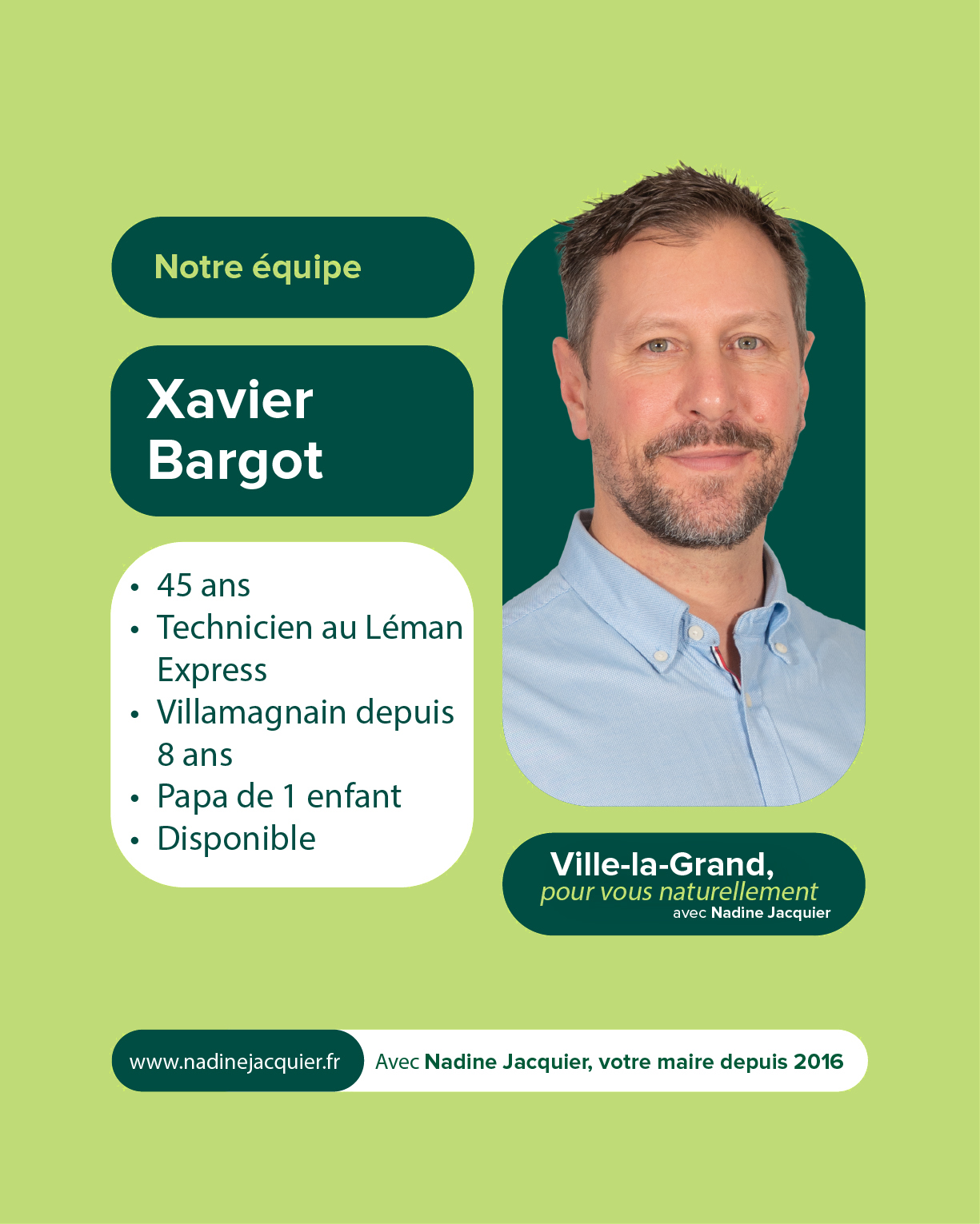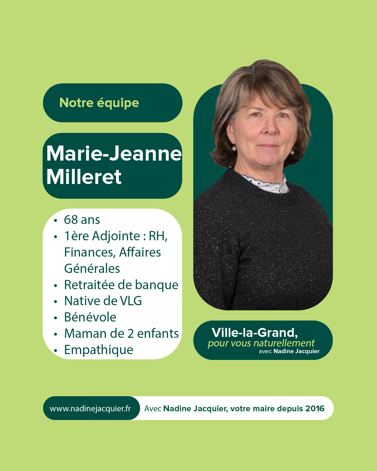 Votre soutien et votre confiance nous sont précieux. À très bientôt pour la suite de cette aventure collective. Alors si vous voulez voir aboutir l’ensemble des projets initiés : votez pour la liste menée par Nadine Jacquier “Ville-la-Grand, Pour vous naturellement” le 15 mars prochain.