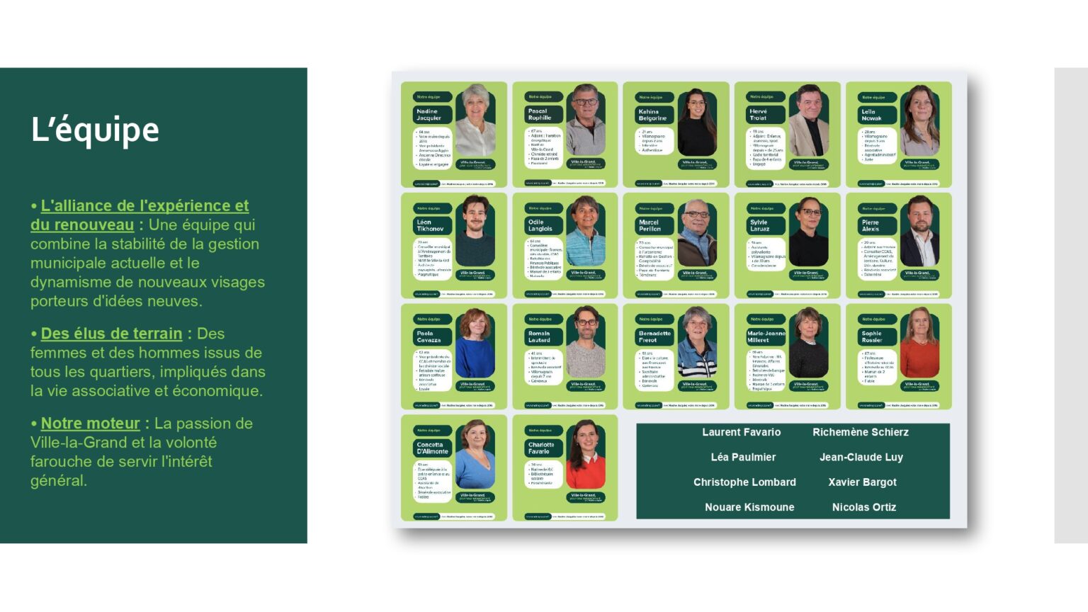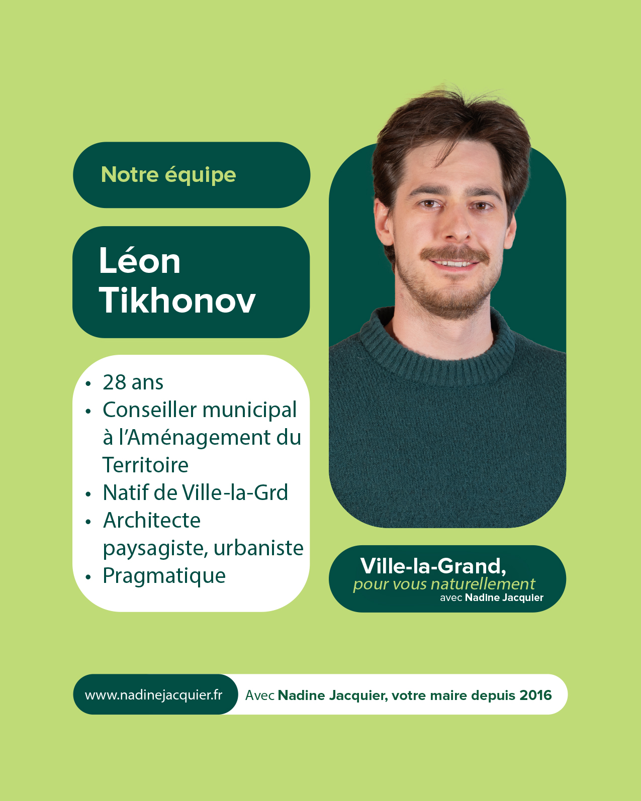 Au fil des semaines, nous vous présenterons les membres de notre équipe : des élus sortants, dont vous connaissez l’engagement au service de Ville-la-Grand, et de nouveaux visages, motivés et prêts à s’investir. Cette alliance entre l’expérience, la connaissance de notre ville et l’énergie d’idées nouvelles est au cœur de notre projet pour Ville-la-Grand, au service de toutes et tous.