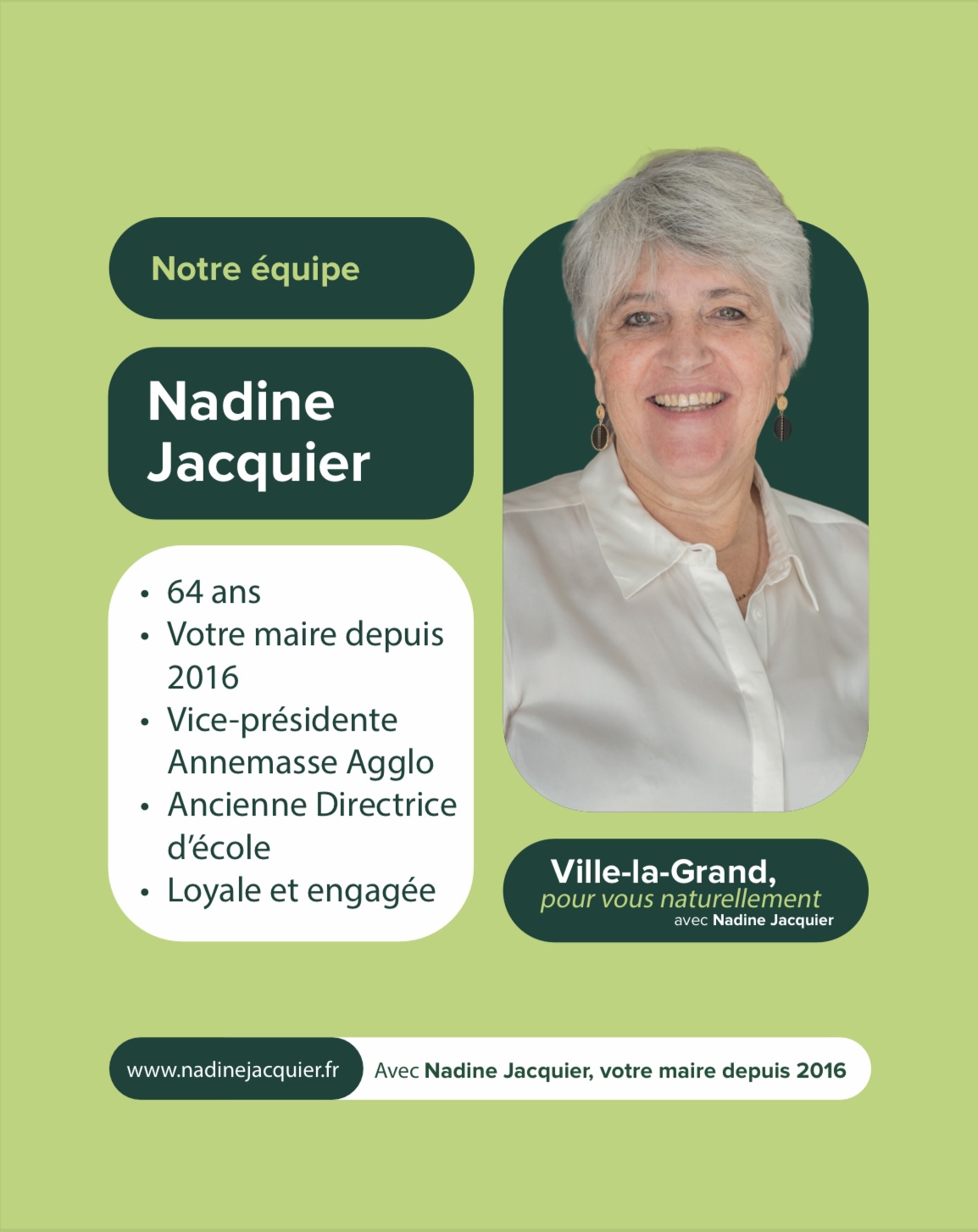 Élue municipale depuis 2008, Nadine Jacquier se prépare à solliciter un troisième mandat à la tête de Ville-la-Grand. En 2026, celle qui a succédé à Raymond Bardet fêtera ses dix ans de fonction en tant que maire. Elle a d’abord exercé comme adjointe, avant que son prédécesseur, figure marquante de la commune, ne lui cède son fauteuil en 2016. Elle occupe également un rôle à l’échelle intercommunale, comme vice-présidente d’Annemasse Agglo, en charge notamment des voies et espaces publics, de l’enseignement artistique, de la culture et de l’éducation.