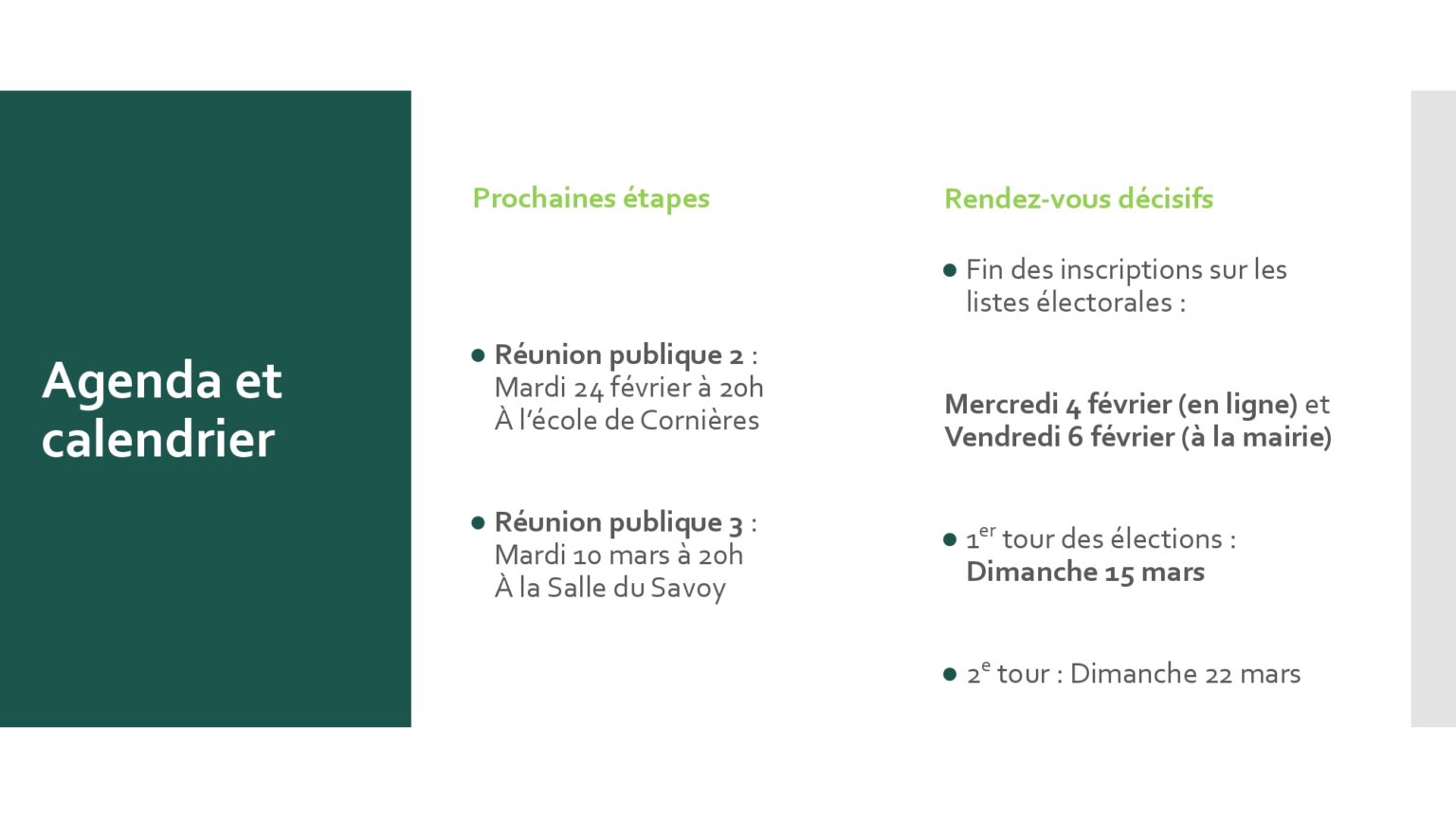 Cette rencontre nous a permis de vous présenter notre équipe, de revenir sur les prochaines dates importantes, de faire un point sur notre bilan et surtout de partager notre vision pour Ville-la-Grand. Nous avons également présenté les grandes lignes de notre programme, volontairement non exhaustif, qui sera prochainement distribué dans vos boîtes aux lettres.